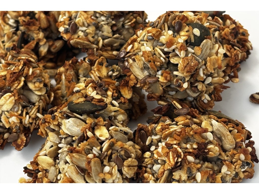 Alergeny: Slunečnicová semínka, Ovesné vločky, Med, Strouhaný kokos, Chia, dýňová semínka, sezam, Bílek